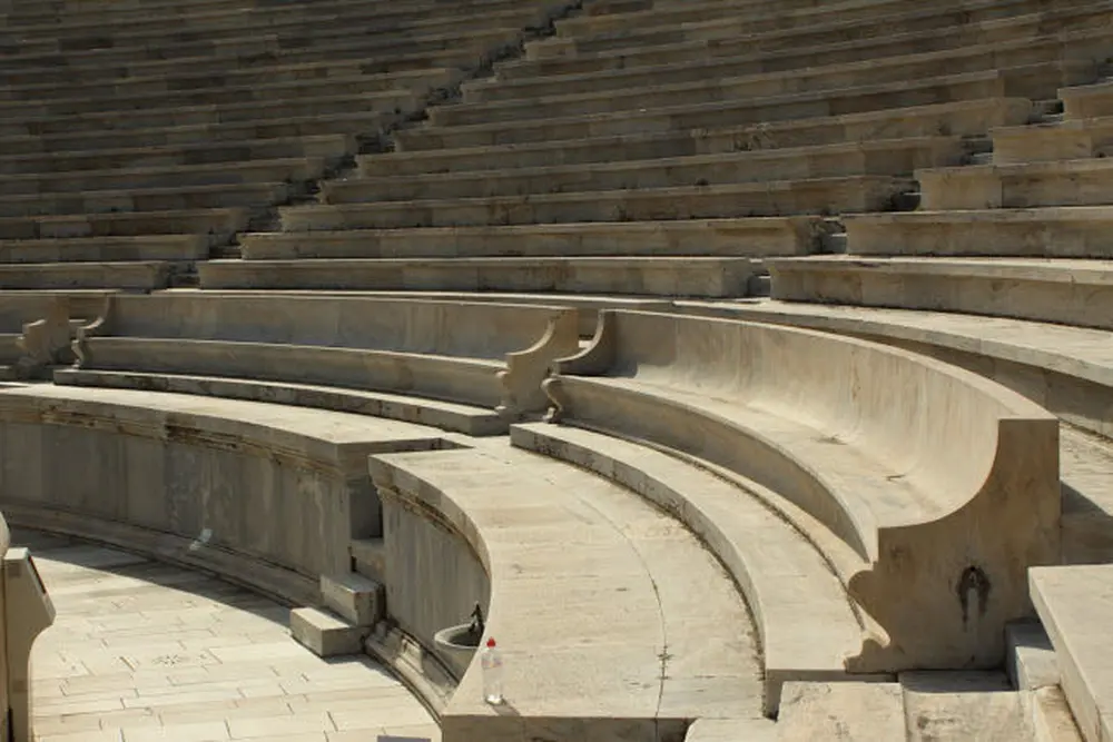 In Roman times the city of Athens was no longer a political power. However, it enjoyed a new intellectual and artistic heyday in the reign of Emperor Hadrian, between AD 117 and 138. In this period, the orator and sophist Herodes son of Atticus spent part of his vast fortune on erecting splendid buildings in many sanctuaries and cities of the Roman Empire. Thanks to the generosity of Herodes, significant works were carried out in the Stadium between AD 139 and 144, which resulted in two main changes to the initial form: the conversion of the original rectilinear shape to horseshoe shape by adding the sphendone, characteristic form of Greek stadia in Roman times, and the installation in the space for spectators, the theatron, of rows of seats (edolia) of white Pentelic marble. A vaulted passage under the east retaining wall terminated at the back of the Stadium. On the track (stibos), marble slabs demarcated the starting line (aphesis) and the finishing line (terma). Integral elements of the track were the bifacial herms. The entrance acquired a propylon in the Corinthian order. A triple-arched marble bridge spanning the Ilissos secured easy access to the Stadium from the city. The whole space, and primarily the portico at the level of the sphendone, was adorned with statues of marble, bronze and even gold. The temple of the goddess Tyche/Fortuna, housing the ivory cult statue of the goddess, had been built on the summit of Ardettos. The Athenians were justly proud of the Panathenaic Stadium, which was unrivalled in the world. For many years, the tomb of Herodes dominated the hilltop left of the entrance.