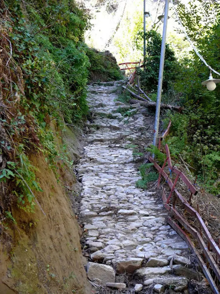 On their way down, on their right hand, travelers meet a shrine. Its only provincial ornament: the iron pillars with overhead cables. These are the only sign of “civilization”, necessary for the operation of the generator, thanks to which there is electricity and music at the annual festival of the Monastery. As travelers follow the pillars towards the precipitous cliff, they come upon a plateau, with a picturesque little church in the middle. On their left hand, in the shade of huge trees, stone steps lead to the holy secret of the area: the little stony whitewashed church of Askitis, which stands at the bottom of a giant rock.