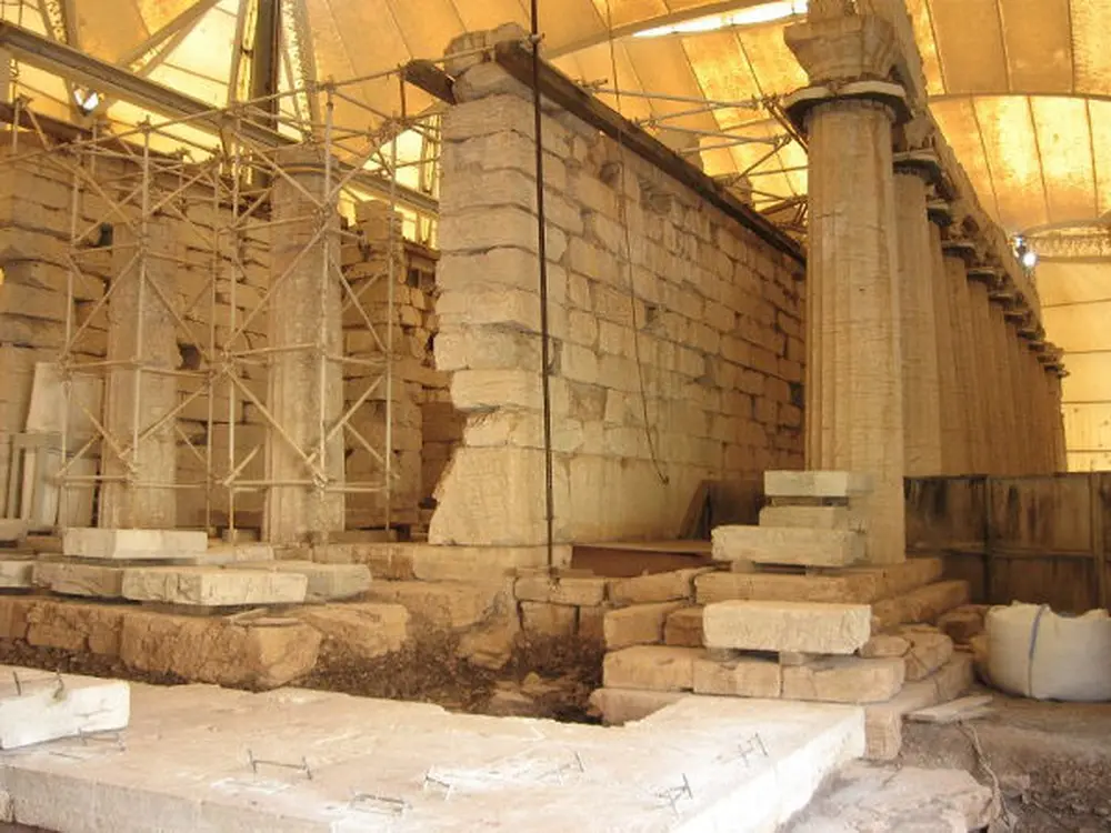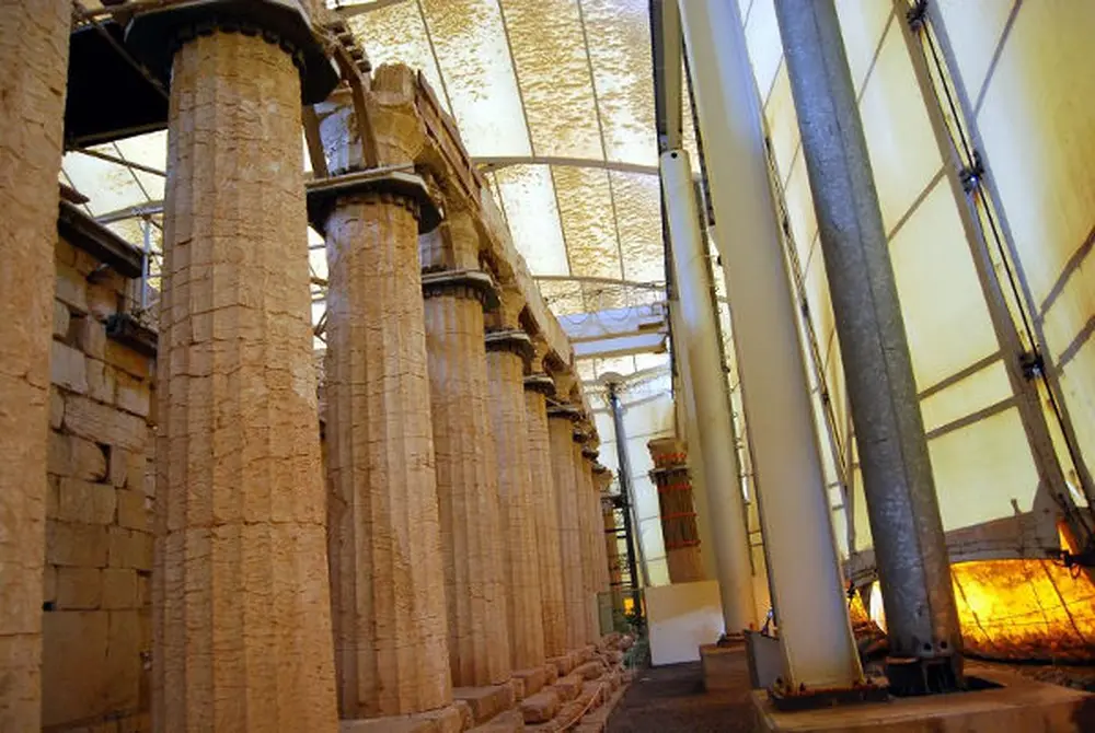 The carved slabs were brought to light in 1812 as a result of systematic excavations carried out by the group of foreign scientists -enthusiasts fond of antiquities such as J. Foster, C.R. Cockerel and K.H. von Hallerstein. In 1914 the priceless metope was transferred to Zacynthos after dirt-cheap payment to the Turkish governor of the Peloponnese Veli Pasha, and in the end it was sent to the British Museum where it is now exhibited. The temple destruction began in the Roman period as a result of human interference, environmental factors and earthquakes that occurred in the area. The first serious attempt to restore the temple began in 1982-1908 by the Archeological Company, which has done a great work. Since the establishment of the Council for the maintenance of the Apollo Epicurios Temple by the Ministry of Culture, the members of the Council being various scientists, the study of the temple has been systematic and many complex problems have been solved. In order to preserve the temple, they realized as top priority measure the erection of a shelter protecting the temple from the environmental effects and from harmful weather conditions, anti-seismic scaffolding and lightning conductors.