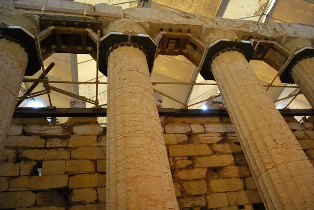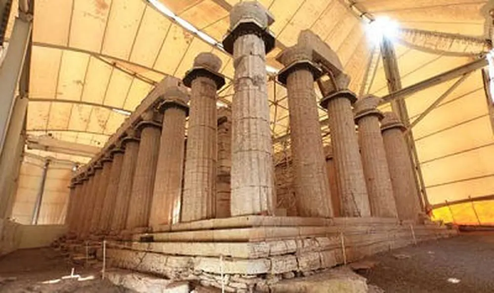 Especially interested is the inside of the temple for its originality, particularly the enclosure, where on the long sides there were thin walls with Ionic semi-columns and original capitals and semi-circular high bases. The two last inclined semi-columns in the south of the enclosure, arising from the walls where the shrine used to be. Between them there was a free column with the oldest known Corinthian capital in the history of Greek architecture. In the eastern wall of the shrine enclosure there was a door, evidently, for sunlight admission so as to light the worshipped statue of the god placed there. The semi-columns of the shrine were supporting a low Ionic frieze which was made up of an epistyle sustaining the famous marble carved metope running round the four sides of the enclosure. The metope (with total length 31 m and height 0.63 m) consisting of 23 marble carved slabs, including eleven slabs depicting the fight with the Centaurs and twelve slabs representing the fight with the Amazons. Each slab represents a complete scene or a separate episode. The exceptional sculptures full of vivacity and vigor belong to anonymous artist. Many elements, however, are characteristic of Paeonios who sculptured the famous statue of Nice in Olympia.