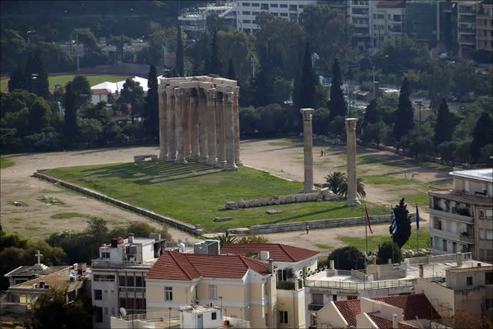 Located in southern Athens, between the Acropolis and the Ilissos river, the Olympeion was the sanctuary of Olympian Zeus. Here stands one of the greatest ancient temples of Zeus and, according to Vitruvius, one of the most famous marble buildings ever constructed. The sanctuary’s foundation is attributed to mythical Deukalion. The site also comprises the temple of Apollo Delphinios – the sanctuary of Apollo Delphinios was traditionally associated with Theseus – and a tripartite building with a south courtyard of ca. 500 BC. The latter has been identified as the Delphinion Court, which was allegedly founded by Aegeas.